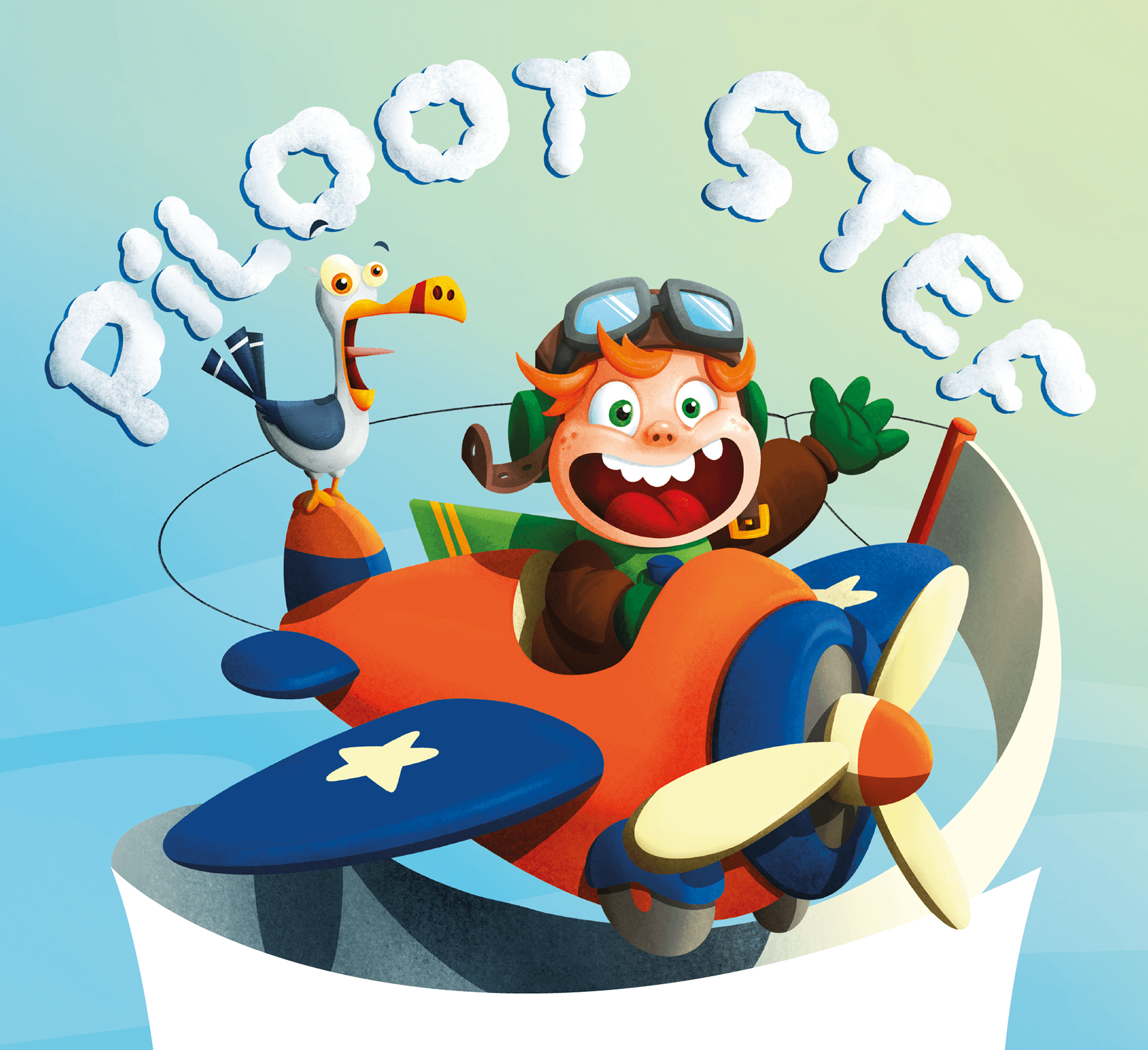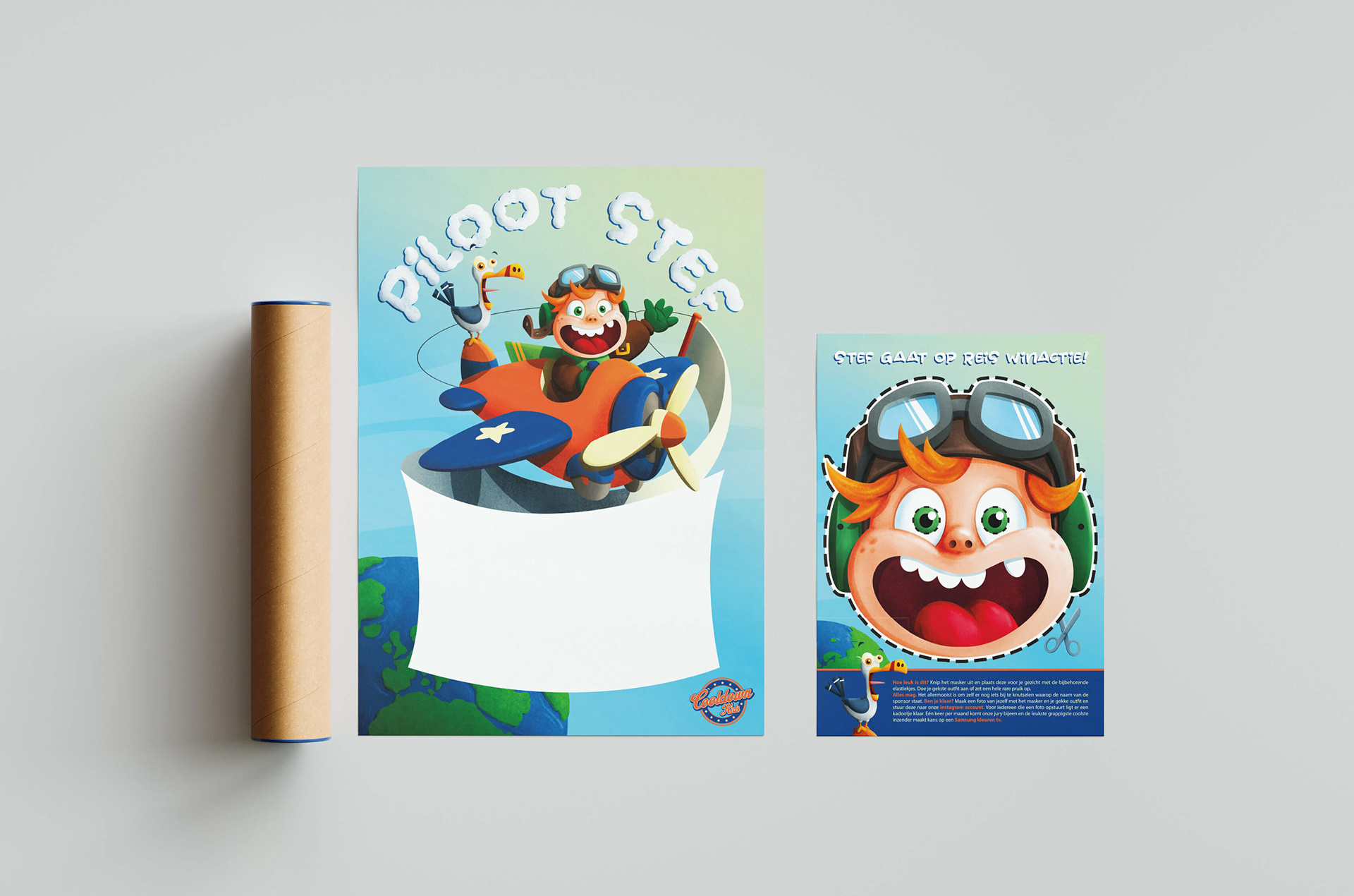 Illustratie en ontwerp van kinderposter Piloot Stef met sponsorruimte en een masker voor kinderen om uit te knippen